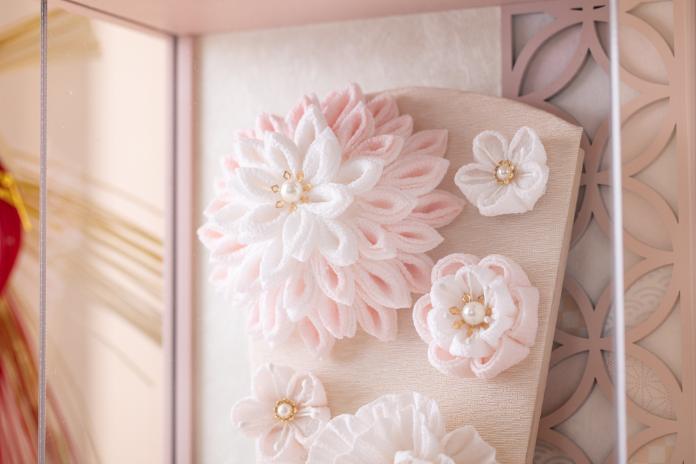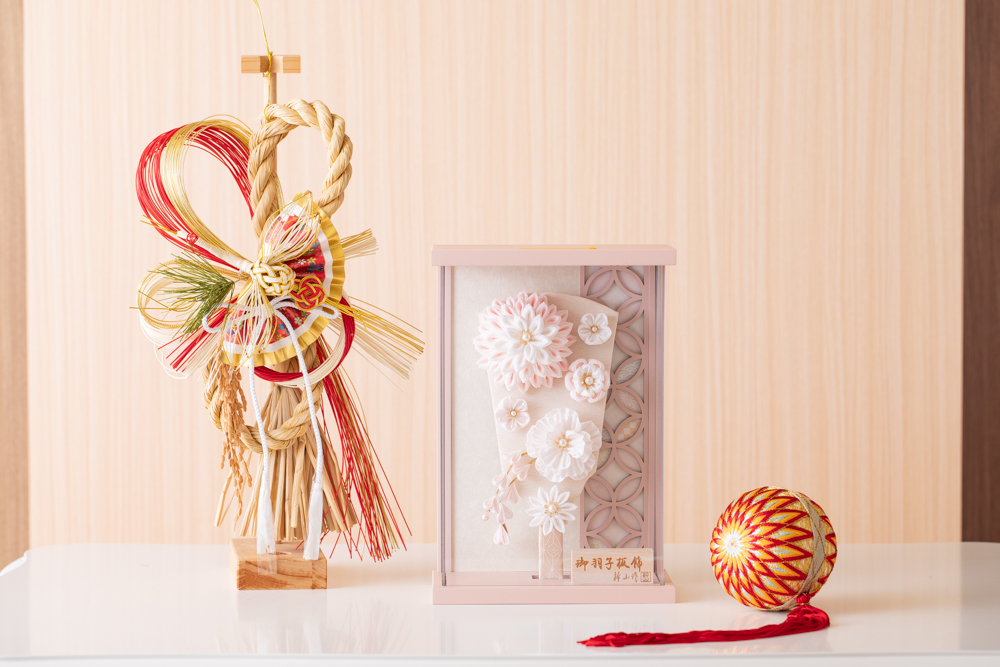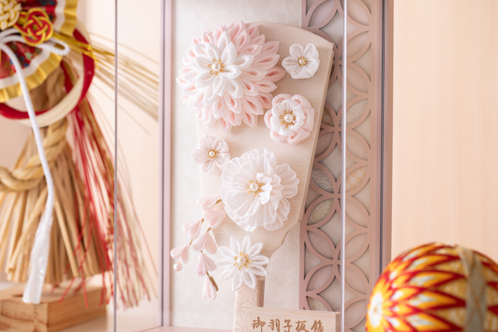 かわいい羽子板ケース飾りです ケースはアクリルですので、軽くて割れにくい素材です 洋間の玄関等に合うよう、ピンクの色合いが特徴です 着物の代わりに国産のつまみ細工でお花を表現 コンパクトサイズで壁掛けもできます つまみ細工は可愛らしく白とピンクを主に ※左右の正月飾りとまりはつきません