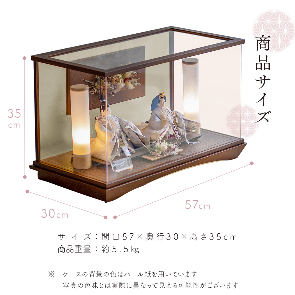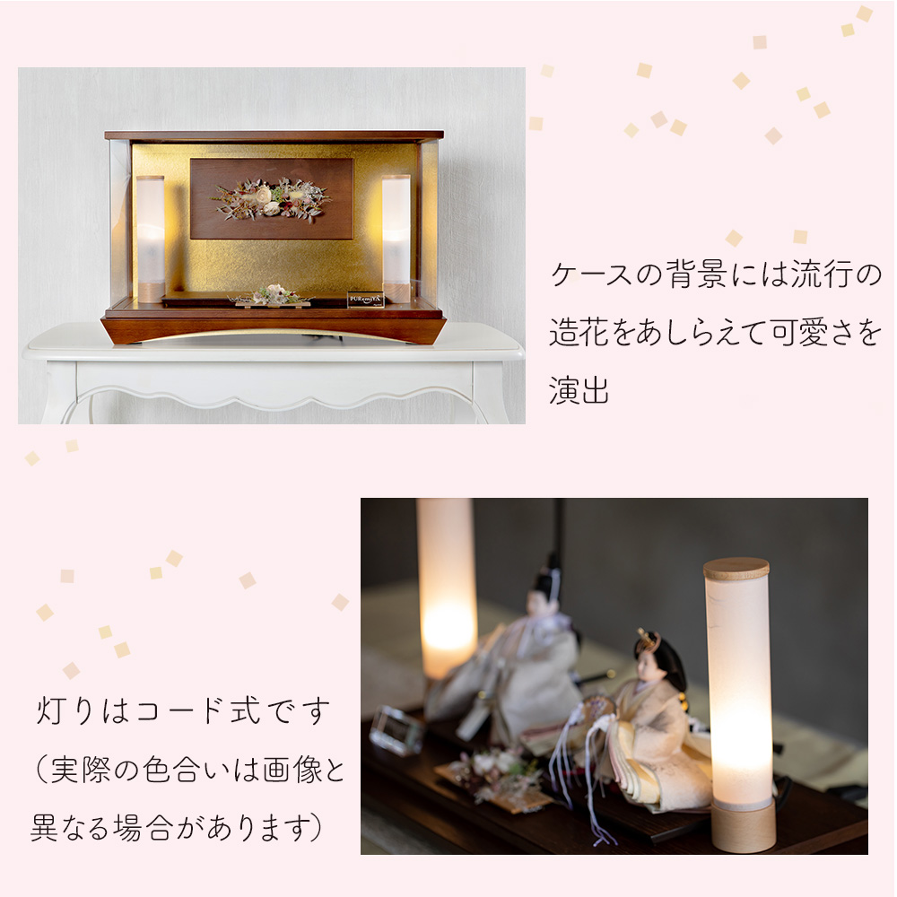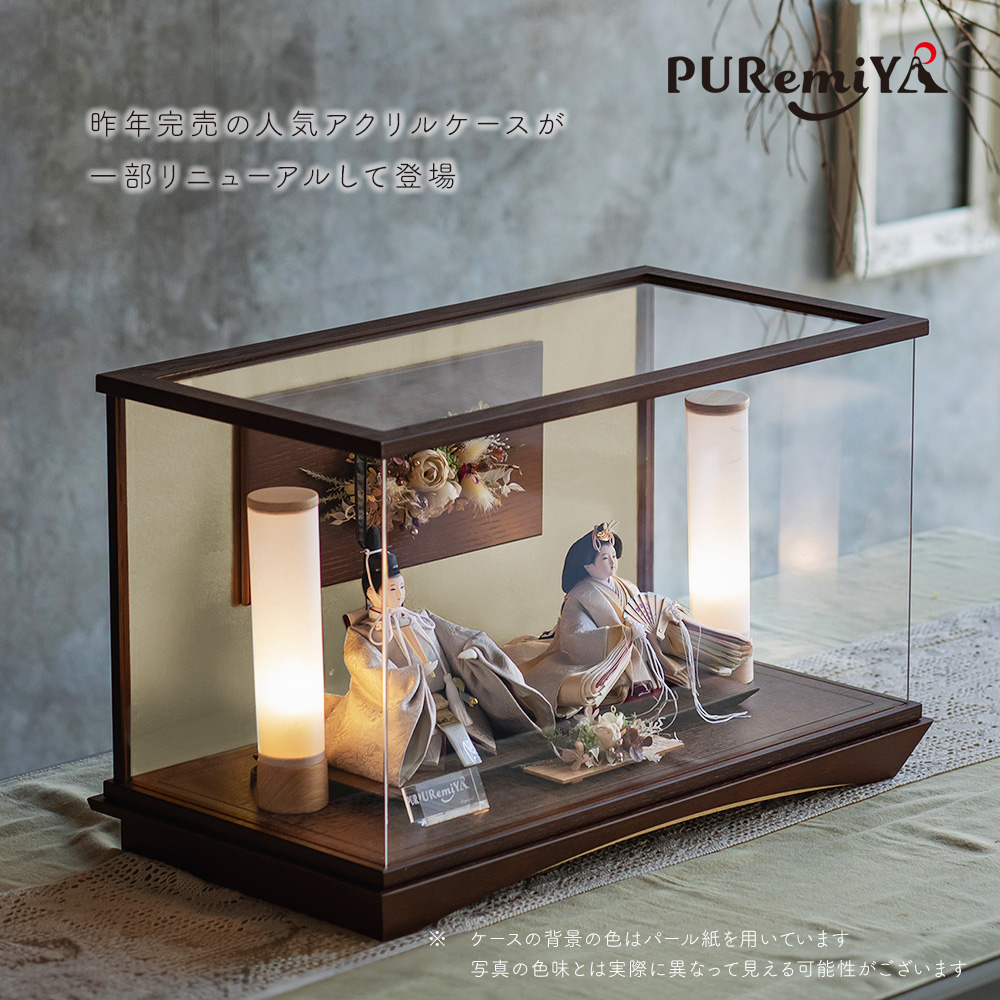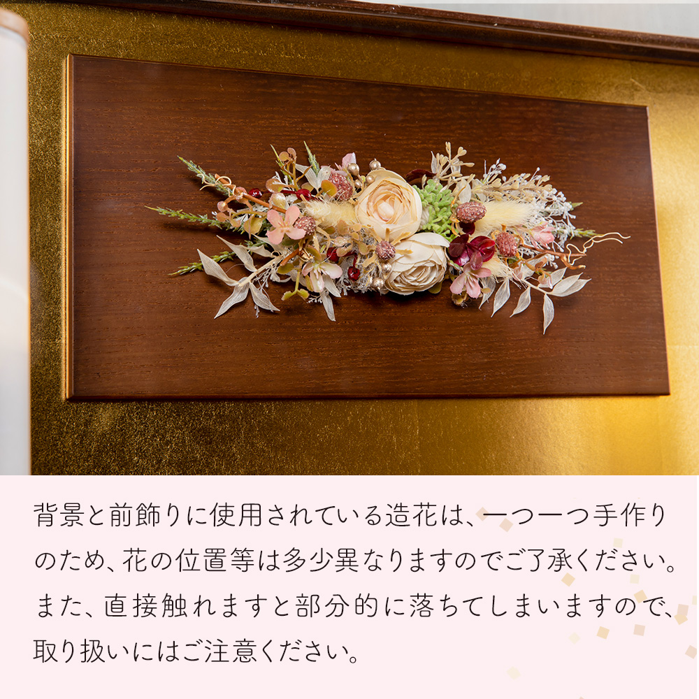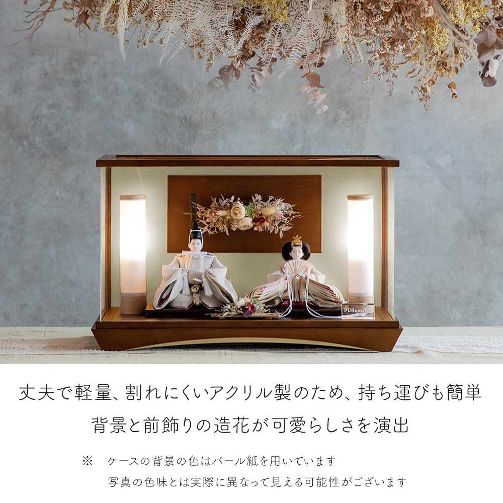 造花をあしらえたアクリルケースです。 ブラウンの濃い色合いが、色の淡いお人形と お互いを引き立てあう商品となっています