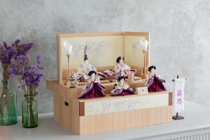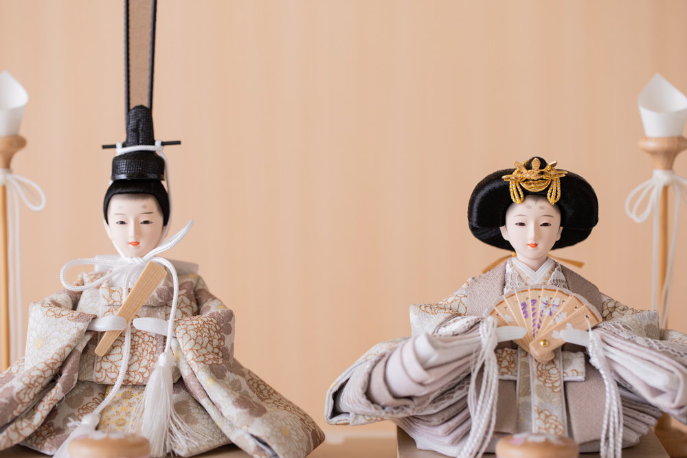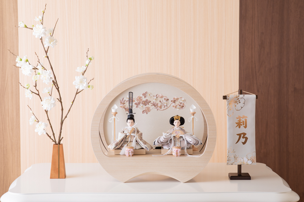 流行りの丸型ケース飾りです ケースはアクリルですので、軽くて割れにくい素材です 洋間の玄関等に合うよう、木目の色合いが特徴です お着物はペアルックの白とベージュ お顔は丸みを帯びたかわいらしいデザインです ケース飾りですので、すべて固定してあります 背景は刺繡でさらに可愛らしさをアップ ※画像のお名前旗は別売りです