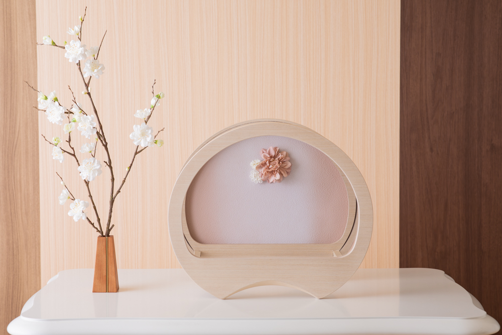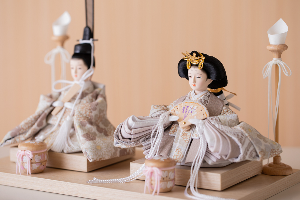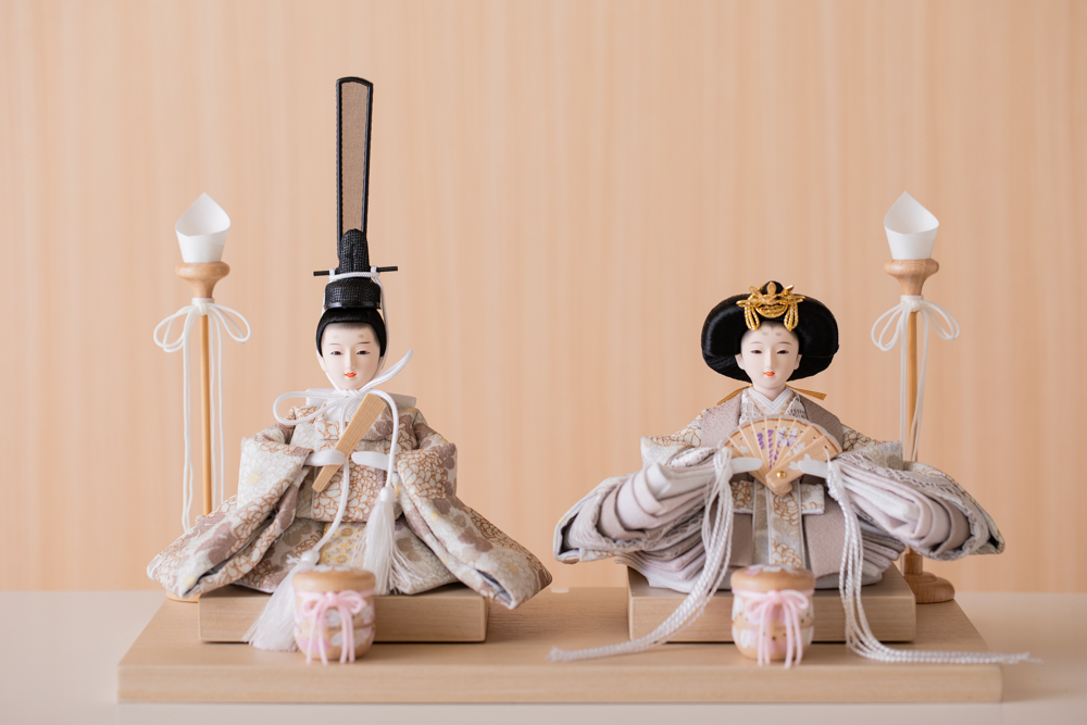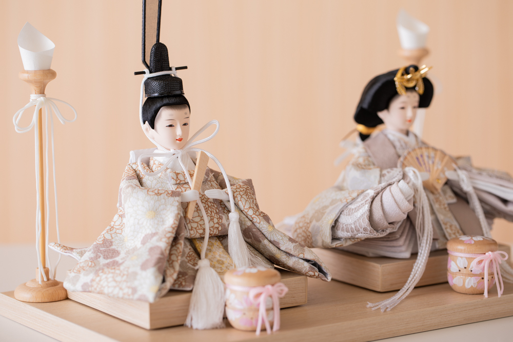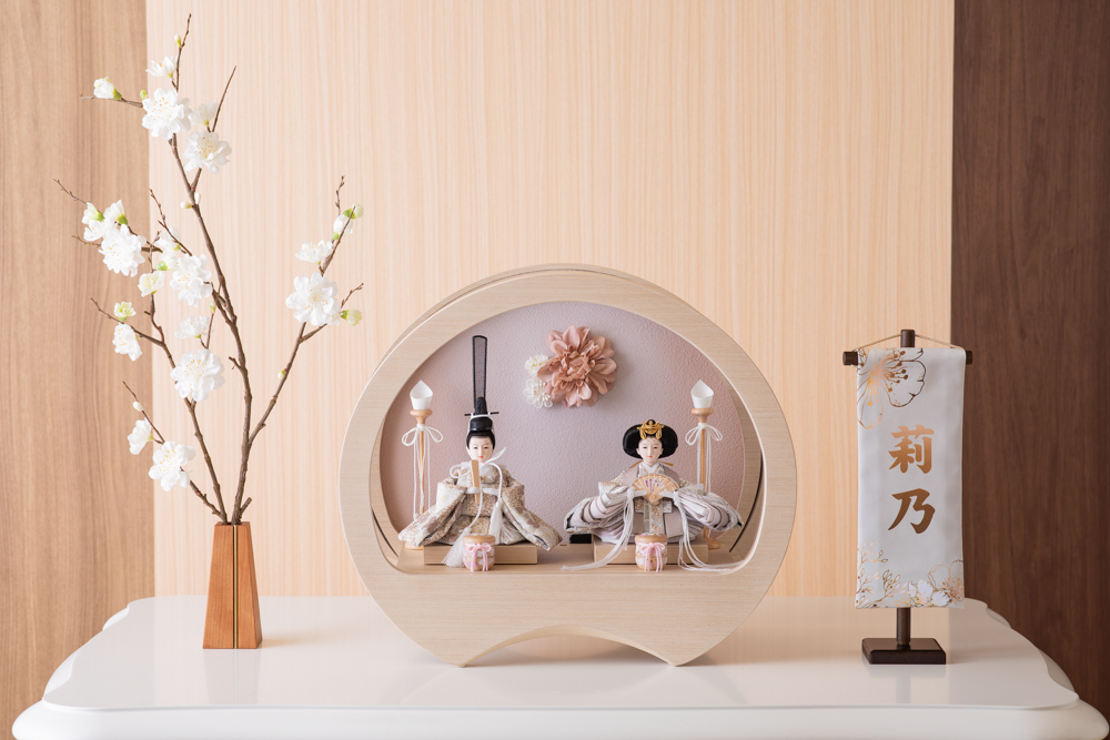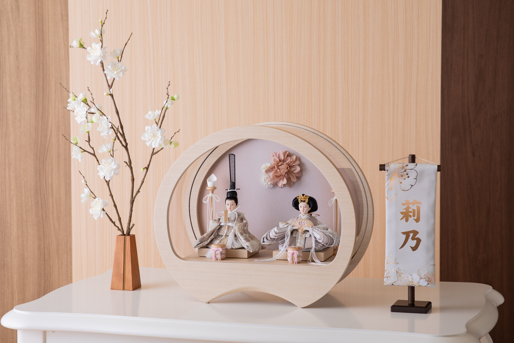 流行りの丸型ケース飾りです ケースはアクリルですので、軽くて割れにくい素材です 洋間の玄関等に合うよう、木目の色合いが特徴です お着物はペアルックの白とベージュ お顔は丸みを帯びたかわいらしいデザインです ケース飾りですので、すべて固定してあります 背景はシンプルにお花をひっそりと ※画像のお名前旗は別売りです