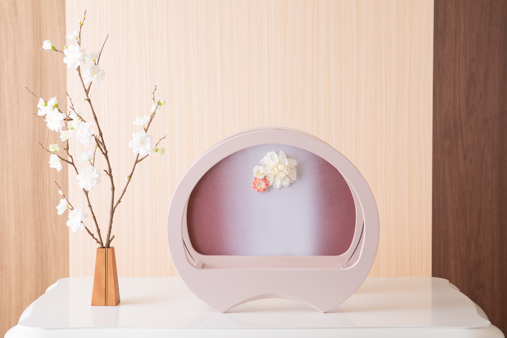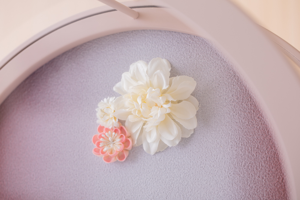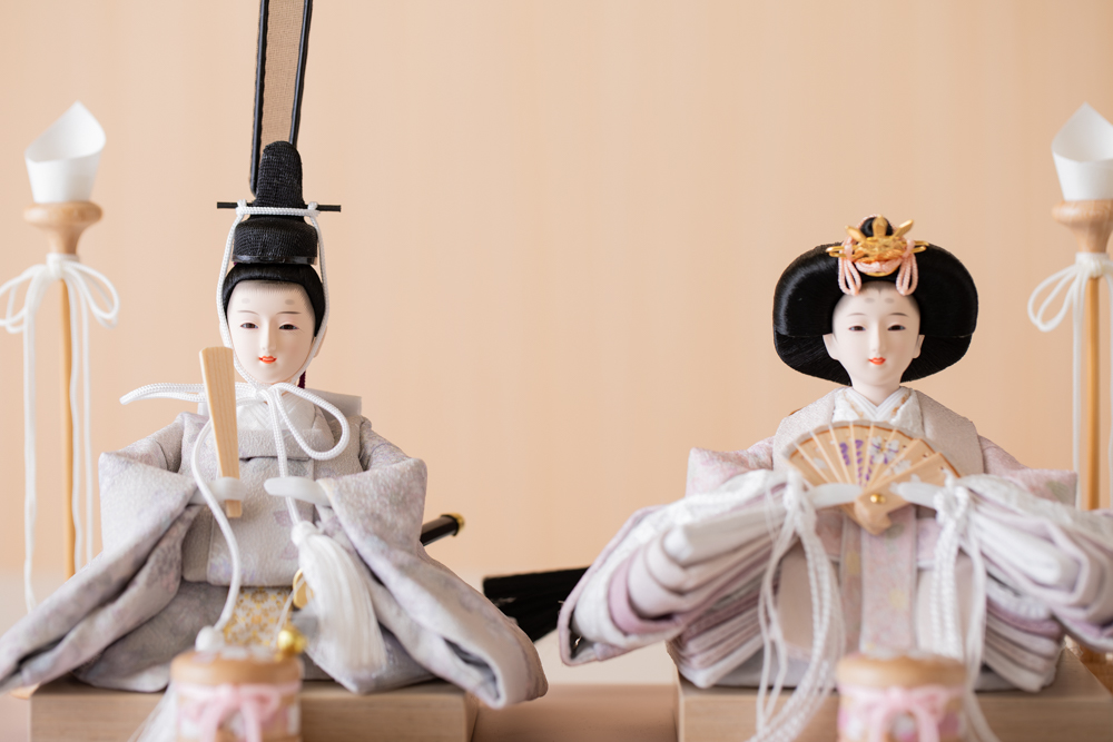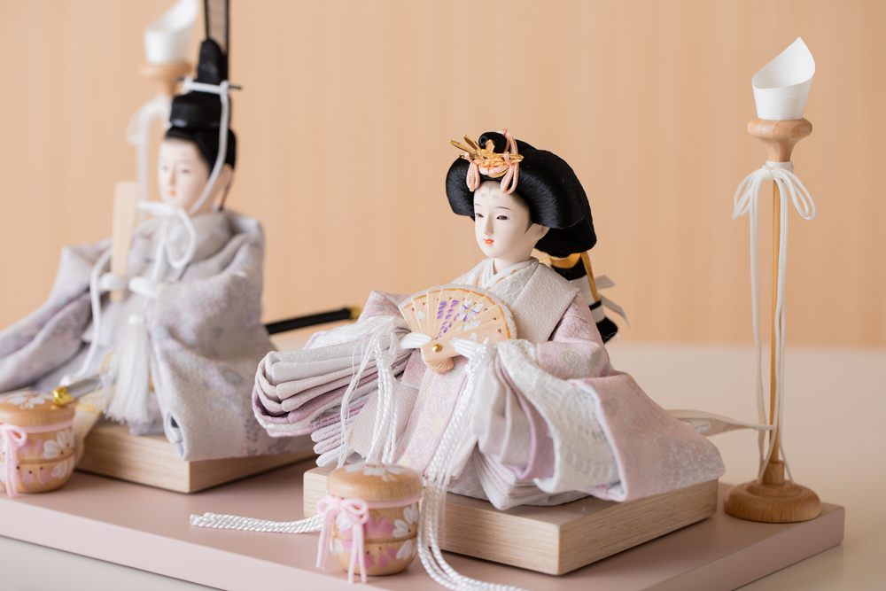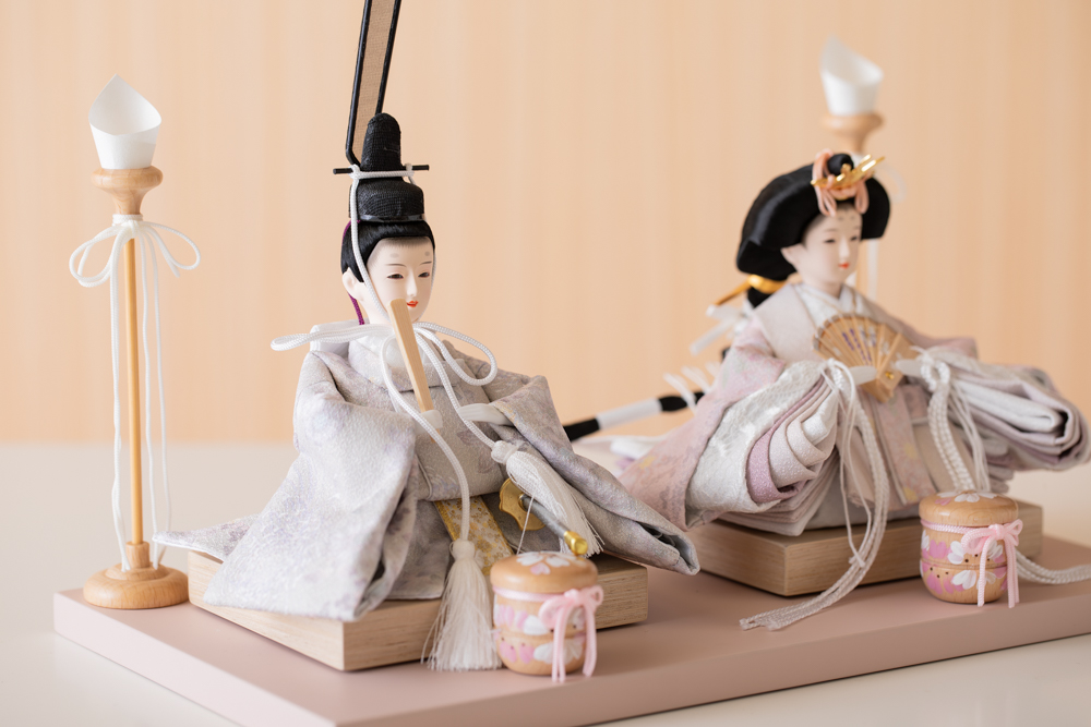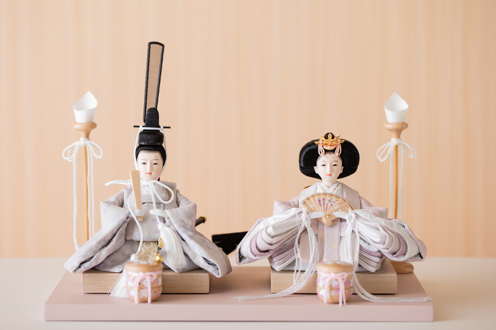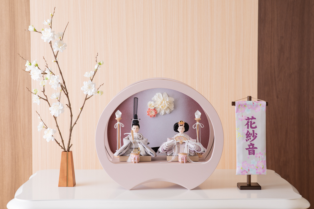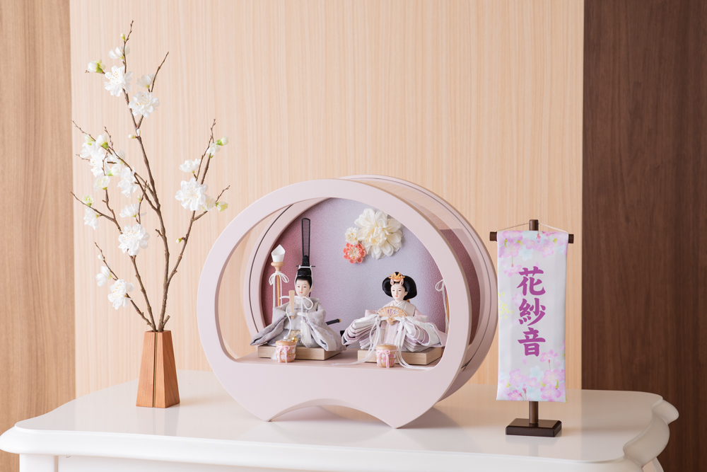 流行りの丸型ケース飾りです ケースはアクリルですので、軽くて割れにくい素材です 洋間の玄関等に合うようピンクの色合いが特徴です お着物はペアルックのグレーとベージュの中間色 お顔は丸みを帯びたかわいらしいデザインです ケース飾りですので、すべて固定してあります 背景はシンプルにお花をひっそりと ※画像のお名前旗は別売りです