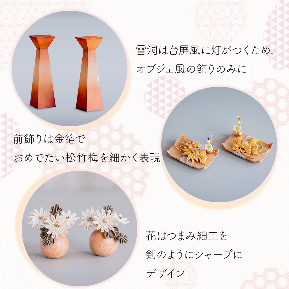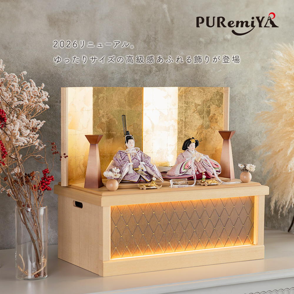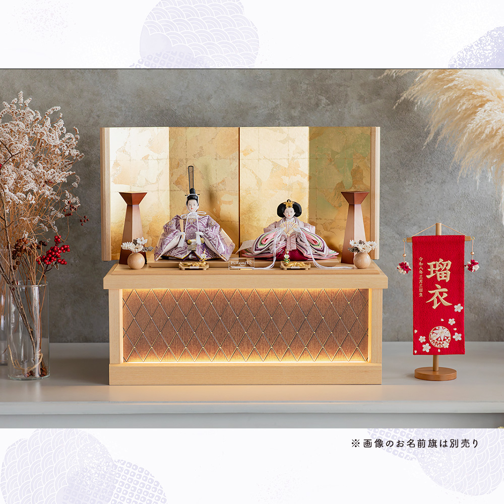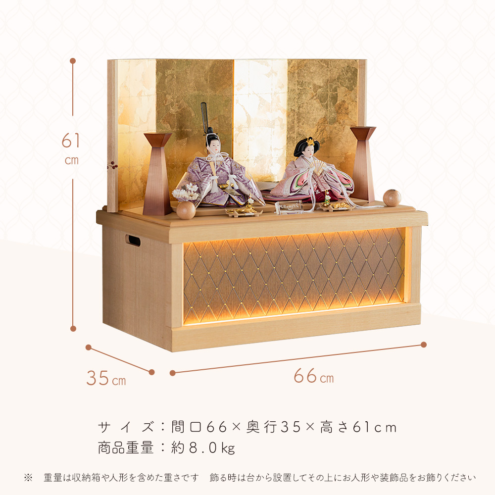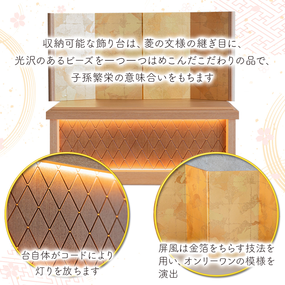 台に灯りを内蔵したモダンな収納飾りです。 高級金箔の屏風が豪華さを一層際立たせます。