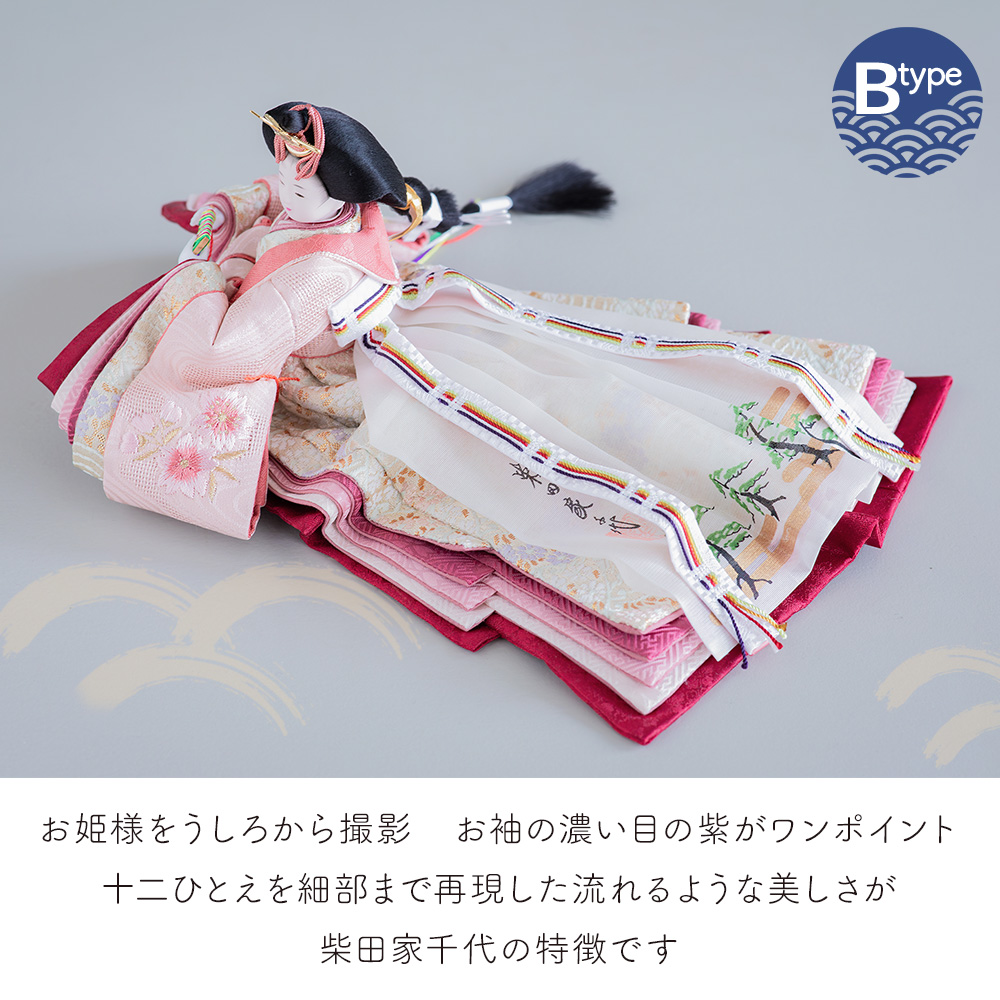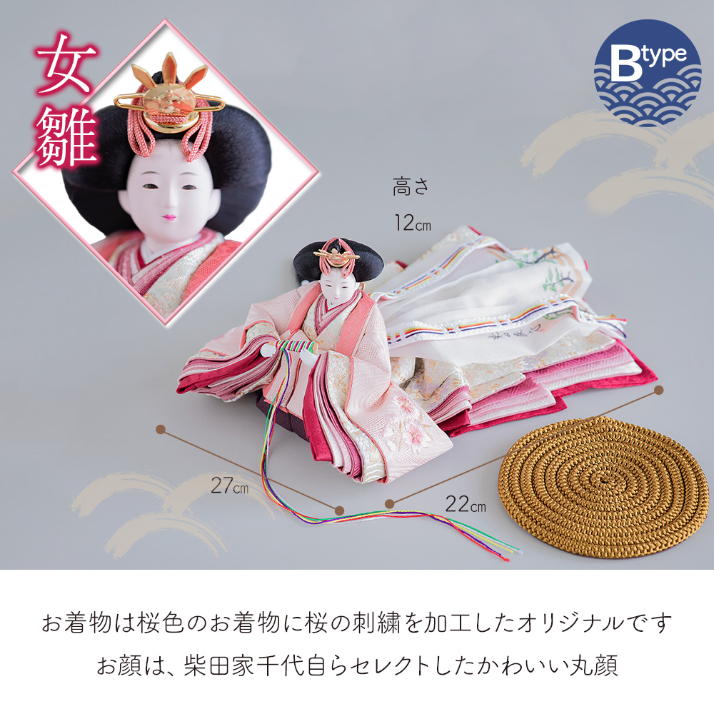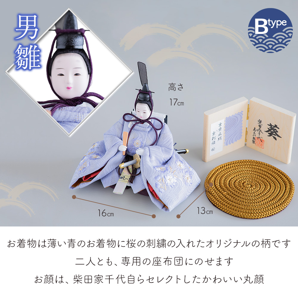 女流作家・柴田家千代(しばたやちよ)作の オリジナル人形飾りです。 あざやかなスカイブルーのお着物は別注品となります。 こちらはBタイプです。