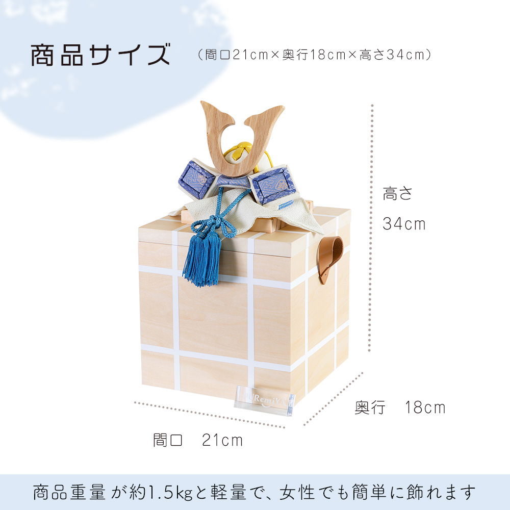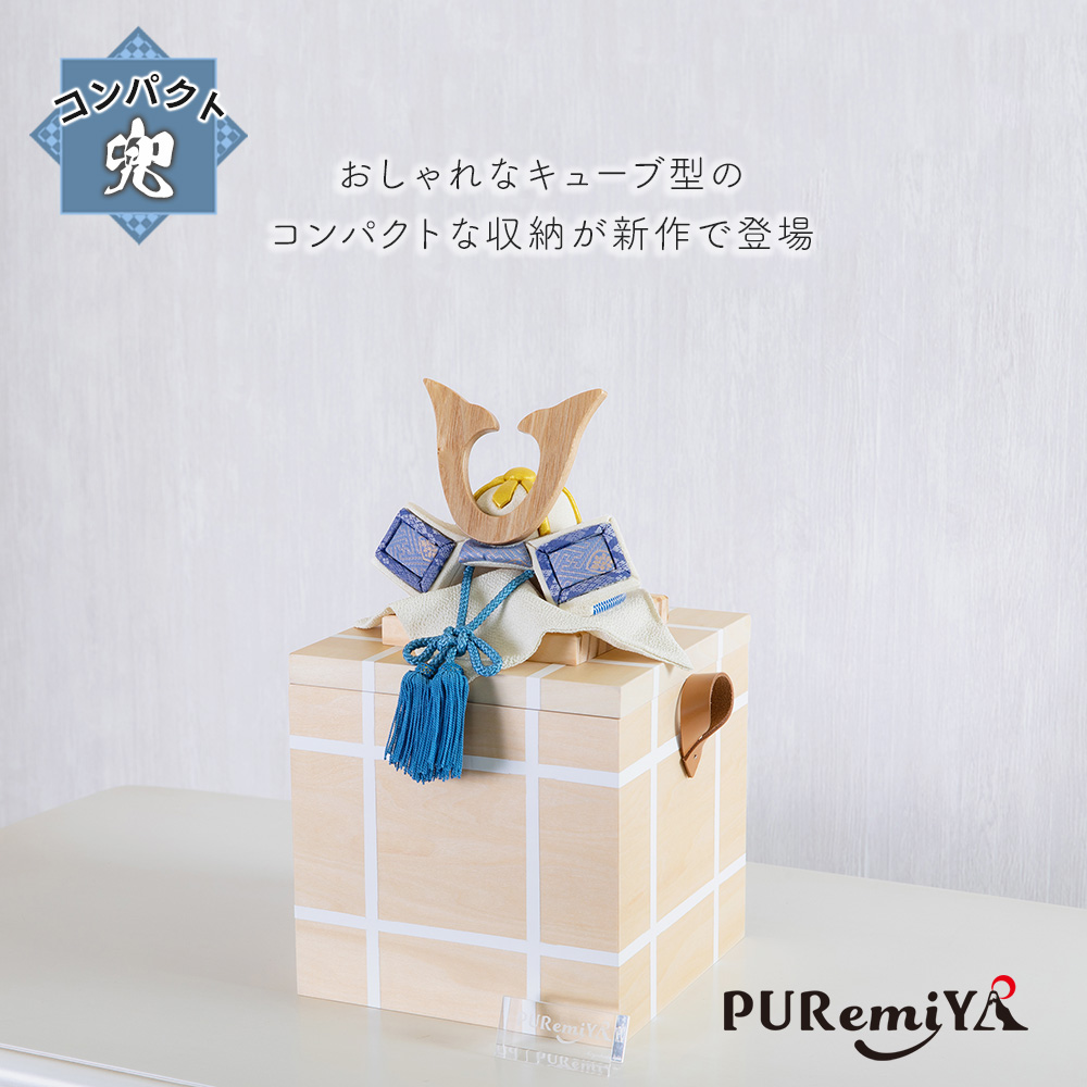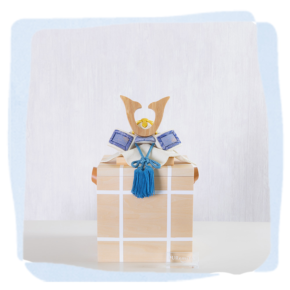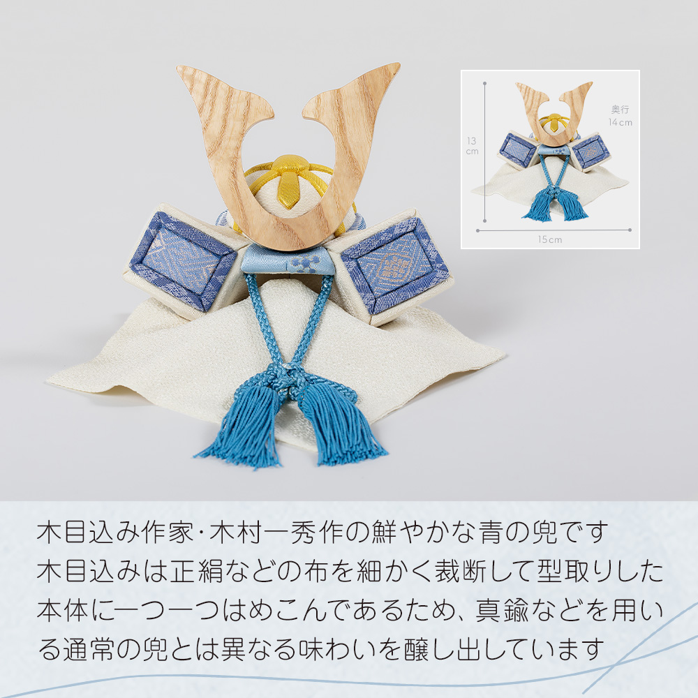 木村一秀作、細密な木目込み兜の 収納飾りです。 茶箱風の収納箱には、市松模様を描き、 節句観を高めています。 兜は五月の抜けるような青空をイメージしています。