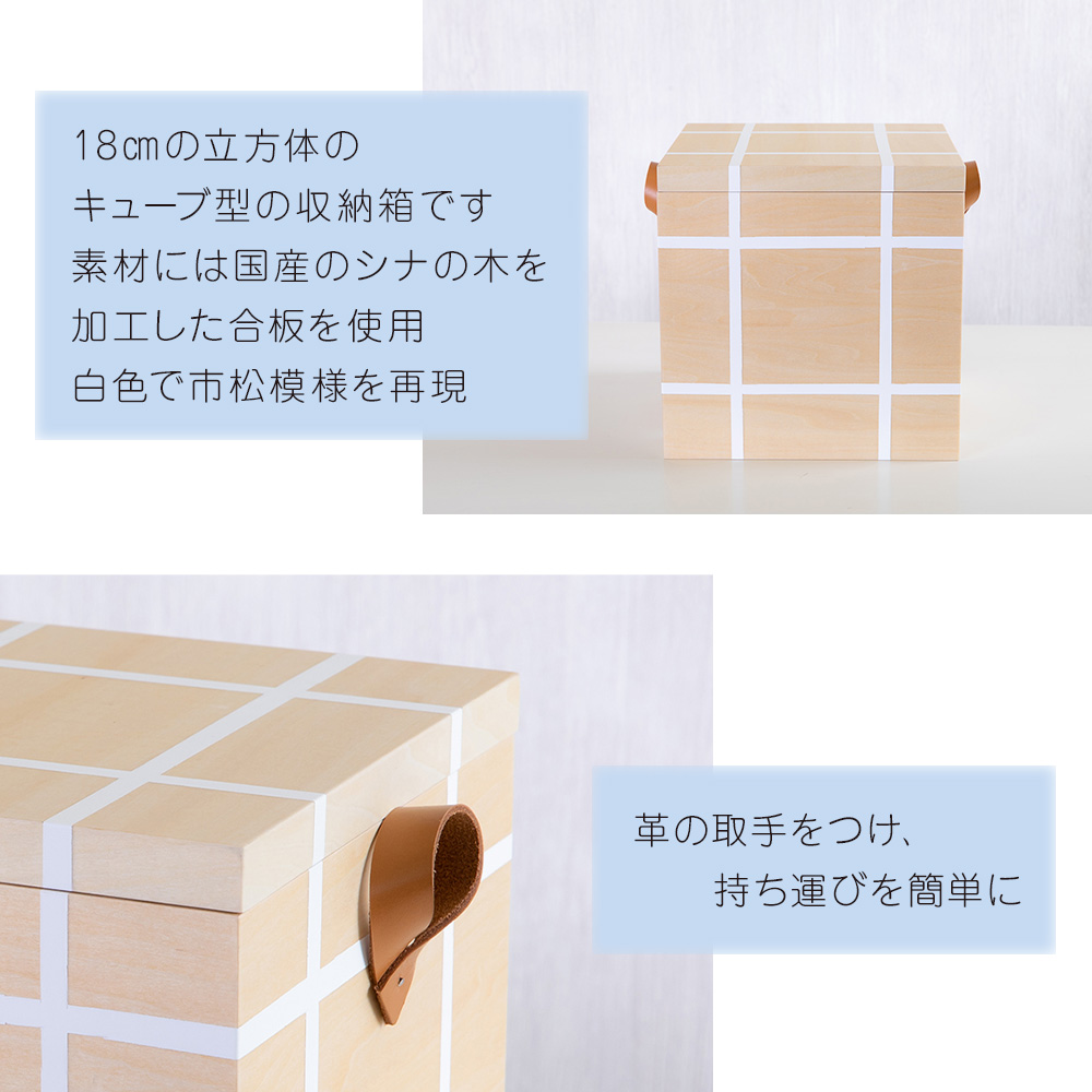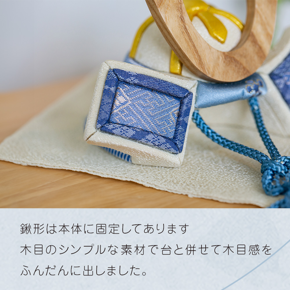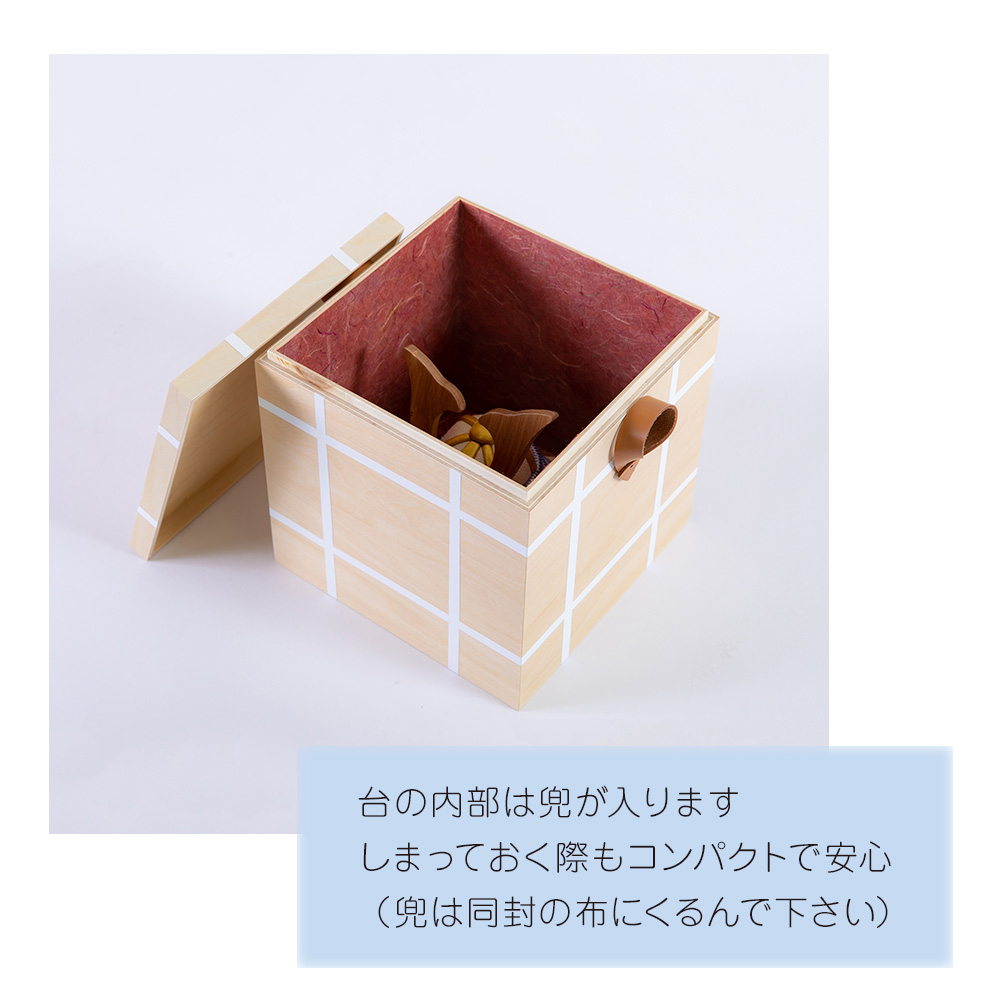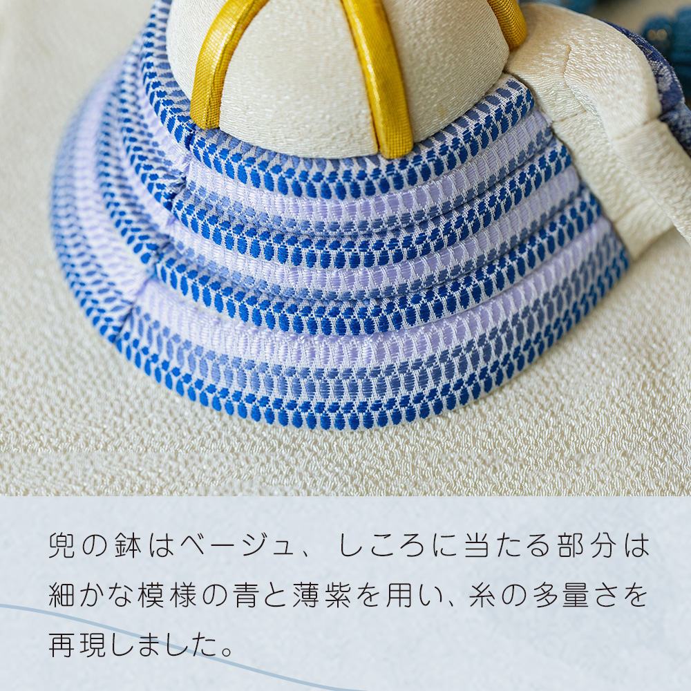 木村一秀作、細密な木目込み兜の 収納飾りです。 茶箱風の収納箱には、市松模様を描き、 節句観を高めています。 兜は五月の抜けるような青空をイメージしています。